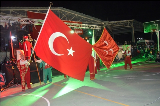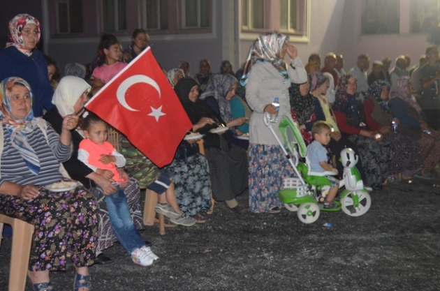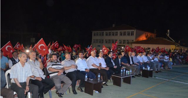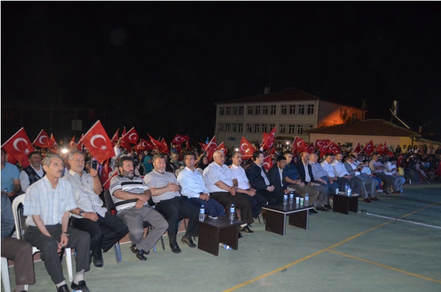 Karaadilli İlköğretim Okulu bahçesinde düzenlenen demokrasi nöbetinde, Güzel Ezan Okuma Türkiye 1.’si Mehmet Erarabacı ve Isparta Erenler Mehter Takımı sahne aldı.